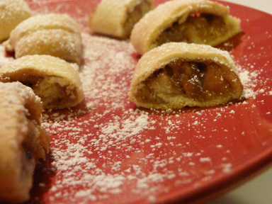 Encalentim el forn a 170ºC. Treim la pasta de la gelera i la dividim en 4 porcions. Feim una bolla amb cada una i l’estiram sobre un paper de forn donant-li forma de rectangle. L’aprimam bé per a què ens quedi ben fina. Hi abocam una part del farcit de plàtan i l’escampam pel damunt deixant els extrems sense farcit. No ens hem de passar amb la quantitat si volem que ens sigui fàcil embolicar la pasta. Posam les nous per sobre una mica escampades. Amb l’ajuda del paper embolicam la massa per un extrem, com si féssim un braç de gitano. Quan tenguem el tub fet el posam en una palangana de forn amb el mateix paper vegetal i hi feim talls al damunt cada dos centímetres (per facilitar tallar les galletes una vegada tretes del forn). Feim el mateix amb cada porció de pasta. Ho enfornam durant 20-25 minuts o fins que vegem que la pasta esà ben daurada. Les treim del forn i quan hagin començat a refredar les podrem tallar. Es poden decorar amb sucre glass i acompanyar amb una crema lleugera.