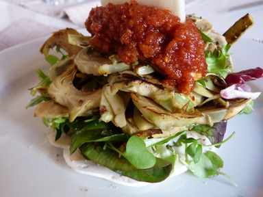 Ensalada tèbia de carxofes amb pesto vermell