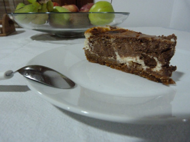 Vos aconsell cobrir el motlle amb paper d’alumini perquè degota bastant i és desagradable l’olor del greix cremant-se dins el forn. Per a la base vaig emprar galletes tipus digestive amb xocolata. Record que la recepta del llibre anava coberta amb nous caramel·litzades, cosa que jo no vaig fer però que vos deix com a idea. Altres vegades les hi he fet i hi diuen molt bé.