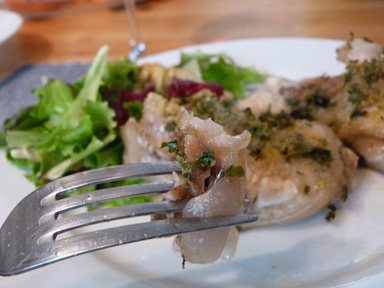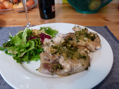 Una vegada cuits, es deixen colar una mica i mentrestant preparam la picada d’all i julivert. Encalentim el forn a 180ºC. Posam els talls en una safata untada d’oli. Hi escampam la picada, espolvorejam la galleta picada per sobre, un raig d’oli i ho posam al forn durant 15 minuts aproximadament o fins que vegem que la galleta és ben rossa. I ja tenim el plat a punt.