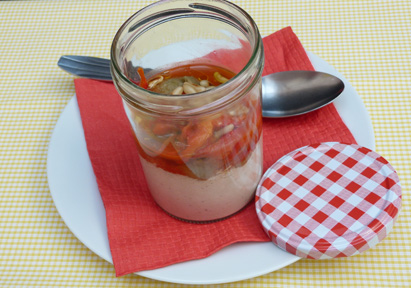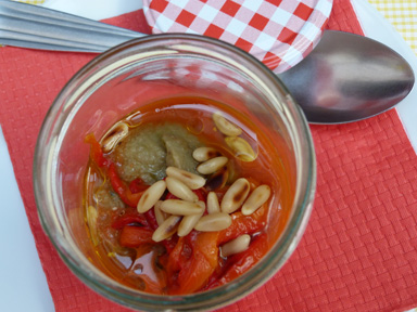 Quan la crema de tonyina sigui freda acabam de muntar el plat abocant al damunt una cullerada dels pebres, una d’albergínia, unes tiretes de pebre vermell, uns quants pinyons, un raig d’oli verge i unes escates de sal. I ja el tendrem a punt per menjar!