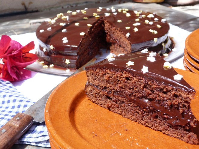 Quan la tarta hagi refredat la desemmotllarem i la cobrirem amb la crema de xocolata. També podem partir-la per la meitat i posar-ne pel mig i després cobrir-la. Aquesta que veis a la fotografia la vaig fer dividint la massa en dos motllos iguals que després vaig muntar unint les dues parts amb la crema. De totes maneres, a mi m’agrada més posar-la en un de sol i després partir-la.