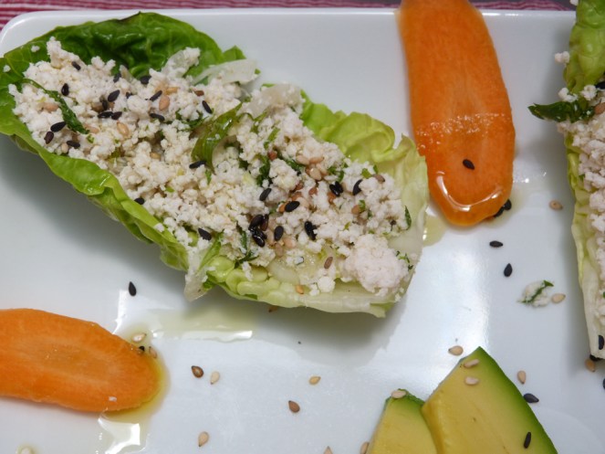 Amb una cullereta omplirem les fulles de lletuga amb la mescla i les disposarem en una safata. Empolvorarem amb les llavors de sèsam i hi posarem un fil d’oli sobre cada una just abans de servir.