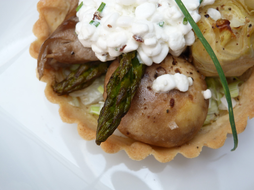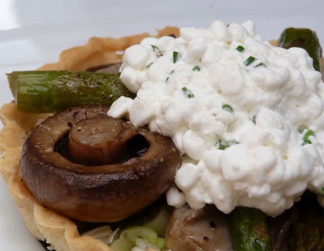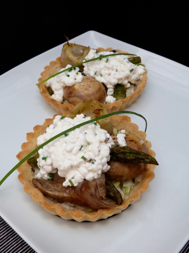 Encalentirem el forn a 180ºC. Quan estigui a punt hi posarem les tartaletes 15 minuts. Treurem les llegums o els pes que hi hem posat i les enfornarem en sec 5 minuts més. Ja a fora del forn hi repartirem el grell picat i les verdures, a les que haurem escolat una mica l’oli amb un paper absorbent. Ho enfornarem uns 10 minuts. Mentrestant picarem el ciboulet i el mesclarem amb el formatge cottage. Repartirem el formatge en cada tartaleta i ho enfornarem 5 minuts més. És recomanable deixar-les reposar una mica per a què la pasta refredi i agafi consistència.