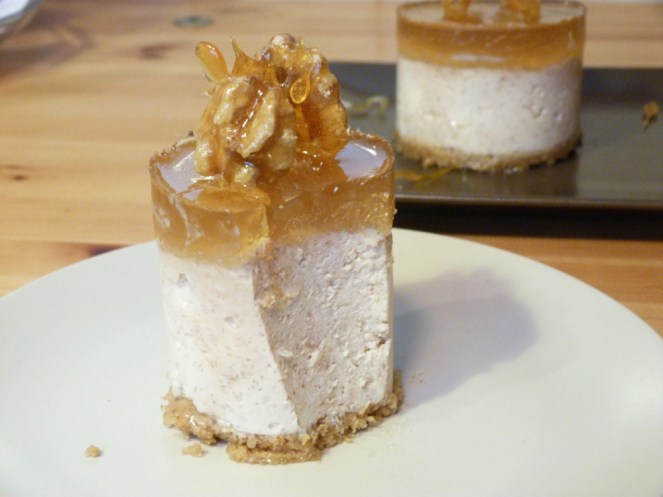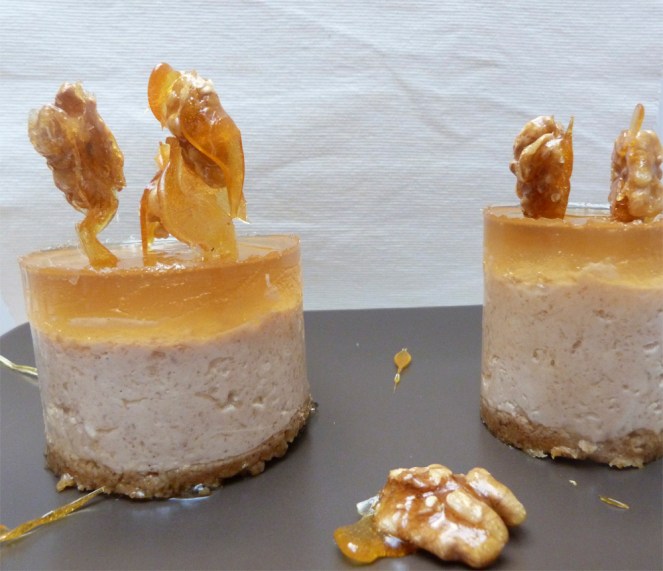 La meva versió és molt fàcil de fer, només que és millor que es faci d’un dia per un altre per a què qualli bé. Si canviau el brossat per formatge cremós tendreu una tarta philadelphia de tota la vida. He baratat la nata per llet evaporada per alleugerir una mica el pastís. La veritat és que estic contenta amb el resultat, la mescla de les textures és interessant i les nous semblen papallones atrapades en ambre, les pobres!