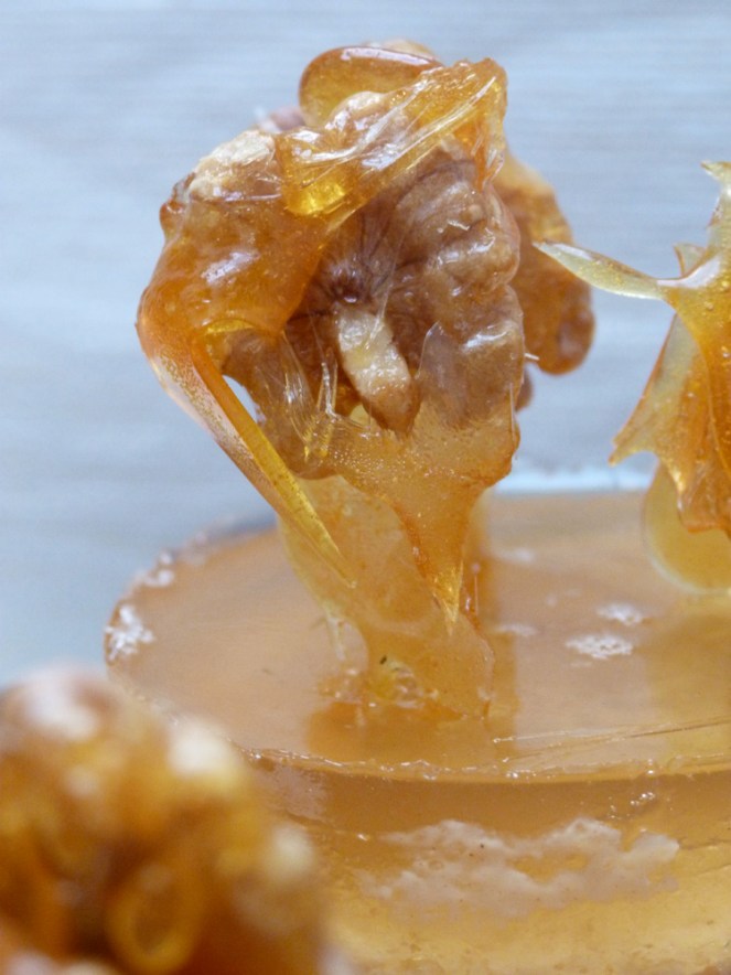 Per fer els caramels de nous posarem el sucre en una paella. Quan s’hagi fos hi incorporarem les nous i les mesclarem bé amb el caramel. Les posarem sobre un paper sulfuritzat i repartirem bé el sucre que quedi per damunt les nous. Anant alerta a no cremar-nos estirarem el sucre encara tebi amb els dits per donar-los una mica de forma. Una vegada freds els posarem sobre el pastís així com més ens agradi.
