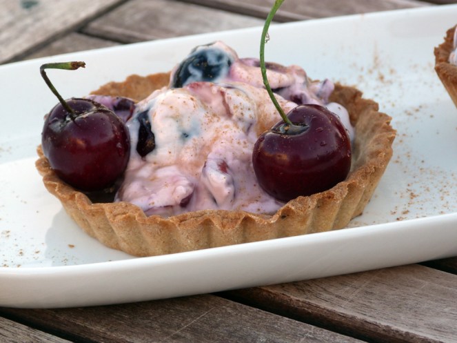 Muntarem les tartaletes quan siguin fredes farcint-les amb la mescla de iogurt. Les decorarem amb les cireres amb pinyol. Regarem cada una amb una cullereta de mel i les empolsarem de canyella.
