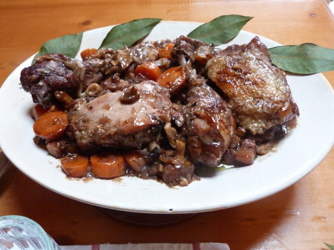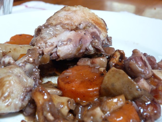 El post d’avui és un plat contundent però ben saborós, una variant del “Coq au vin” que proposava Wholekitchen. El “coq au vin és un aguiat de gall amb vi, verdures i xampinyons que s’incorporen quasi al final de la cocció. He canviat el gall per pollastre i aprofitant que ens trobam en temps de bolets he baratat els xampinyons per blaves i picornells.