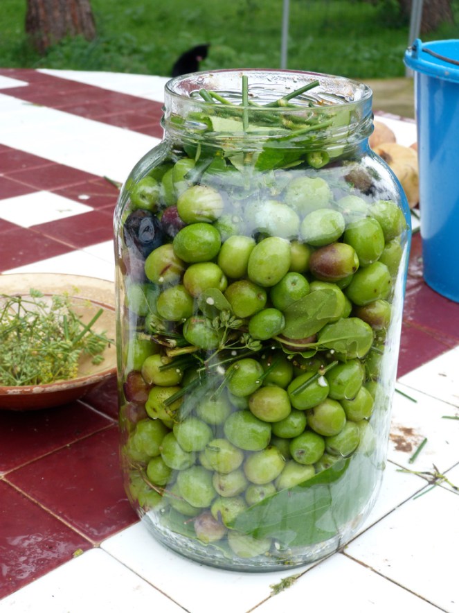 Repassarem les olives amb aigua. Tallarem les branques de fonoll a trossos petits. En el cul del pot de vidre hi farem un llit amb les branquetes de fonoll, dos pebres coents tallats en 3 o 4 trossos, unes fulles de llimonera i unes fulles de garrover. Hi posarem olives fins a mitjan pot, descartant les que estiguin colpejades i tornarem a fer un altre pis de branques de fonoll, pebres a trossos, i les fulles. Acabarem d’omplir el pot amb les olives i repetirem el mateix amb les branques, el pebre i les fulles.