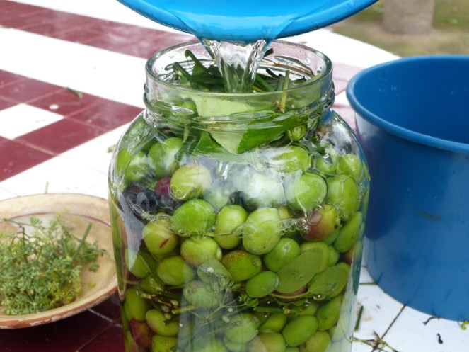 En un recipient a part farem una solució d’aigua-sal. Les proporcions serien d’1 kg de sal per cada 8 litres d’aigua. Pel pot gros que veis a la fotografia hem fet dos litres d’aigua i 250 gr de sal. Ho hem dissolt un poc i hem omplit el pot fins a dalt de tot. Una vegada llest hem tancat el pot amb un tap o amb un plàstic ben fermat i l’hem deixat en un lloc fresc i amb poca claror. Ara només ens cal esperar 2 mesos per tastar les nostres olives. Si les feis trencades no heu d’esperar tant de temps, potser en un mes ja les podeu començar a consumir.