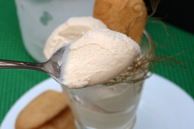 Al sen demà la posarem a la gelatera fins que agafi textura de gelat (uns 30 minuts aproximadament). Un cop així, la podrem servir de seguida o la posarem al congelador fins a l’hora de servir-la.