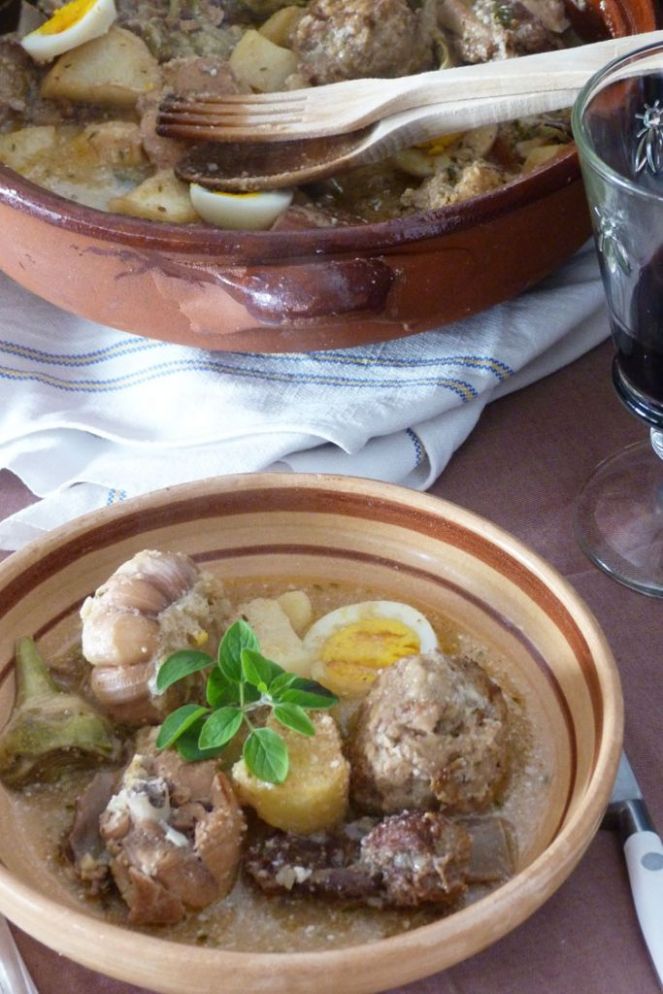Netejarem el pollastre de plumissó. Posarem oli d’oliva en una olla baixa i ampla o un calderó. Començarem a sofregir el pollastre i la costella de porc, remenant-ho de tant en tant. Quan la carn sigui cuita hi afegirem la ceba tallada a daus petits i la deixarem a foc baix. Quan sigui ben rossa hi posarem la tomàtiga ratllada i deixarem que el sofregit es confiti i es cogui bé. Al final de tot hi posarem les herbes, les cabeces d’all senceres, ho deixarem dos minuts. Abocarem el sofregit en una greixonera gran o un calderó alt, abocarem el tassó de vi i taparem la carn amb aigua, salarem. Ho tendrem al foc uns 30 minuts o fins que la carn sigui fluixa.