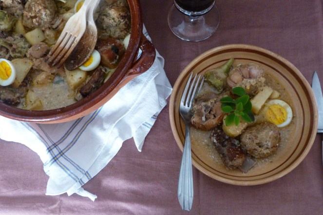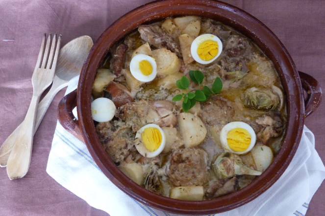 Quan hagi passat el temps indicat, posarem l’ametla picada, les carxofes, les patates i les pilotes dins la greixonera i afegirem aigua, en cas de què sigui necessari. Rectificarem de sal. Sacsejarem la greixonera i deixarem al foc 10 minuts més. Tallarem els ous bullits en rodanxes i els posarem sobre l’aguiat. Aturarem el foc i servirem ben calent. Farem plat repartint la carn i les pilotes a cada comensal