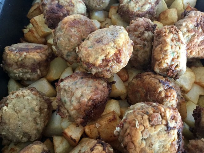 Mentrestant pelarem les patates i les tallarem de cantó. Les fregirem i reservarem. En el mateix oli, fregirem les pilotes per tandes i les reservarem sobre paper absorbent.