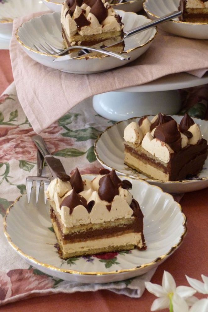 El Pastís Òpera és un pastís clàssic de la rebosteria francesa, l’autoria del qual s’atribueix a diversos pastissers de renom. El que sí sembla clar és que el seu nom fa honor a l’edifici de l’Òpera Garnier de París. Aquest pastís té forma quadrada i es compon per fines capes de bescuit gioconda (bescuit esponjós d’ametla) crema de mantega al cafè, crema de xocolata i xarop de cafè. Es sol acabar amb una capa de geleé de xocolata, cosa que no he fet jo però que podeu fer mirant la recepta de la geleé punxant aquí.