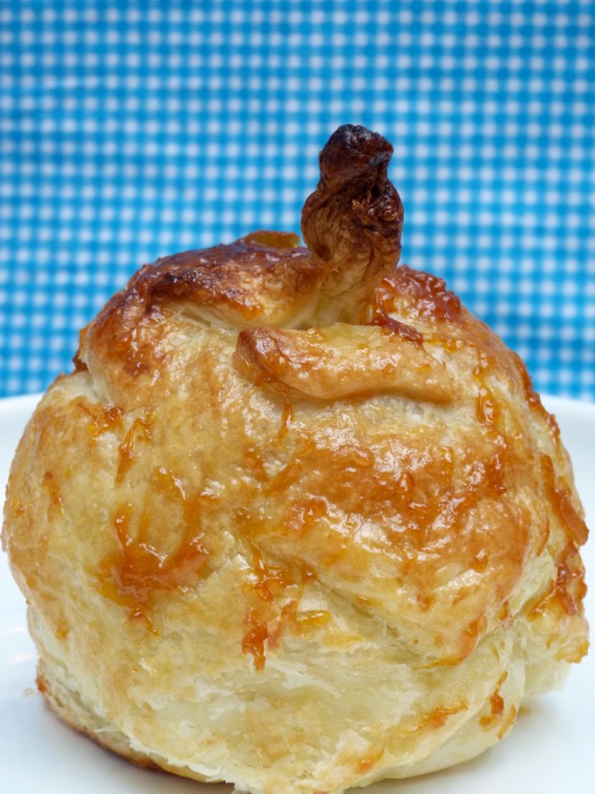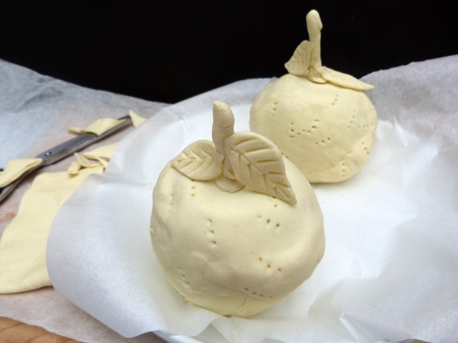 Posam el forn a 180ºC. Buidam el cor de les pomes i omplim el buit amb el torró. Embolicam les pomes amb la pasta de full estirada, tancant-les del tot. Per fer el capoll, embolicarem un trosset d’escuradents amb una mica de pasta i el clavarem al centre.
