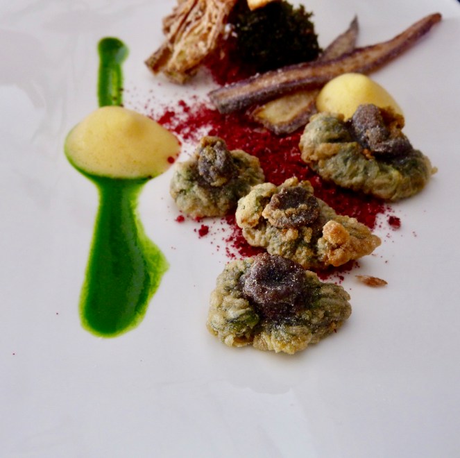 Muntarem el plat amb la terra de remolatxa, una mica del liquat de bledes, les verdures i l’aire de taronja. Hi posarem les ortigues i servirem de seguida mentre encara siguin calentes.