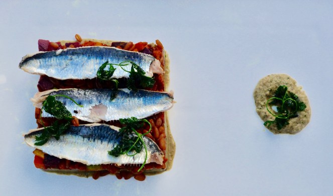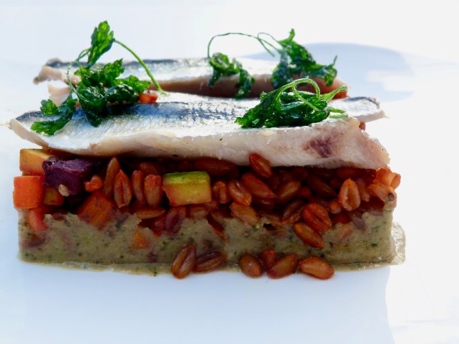 Emplatarem posant el pesto a baix, al damunt un llit del saltejat d’espelta i les sardines. Acompanyarem amb unes escates de sal i a gaudir-ne!