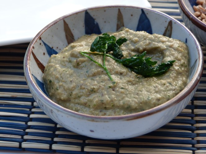 Primer de tot torrarem l’albergínia. L’embolicarem amb paper d’al·lumini i l’enfornarem una hora aproximadament a 180ºC. La treurem quan sigui ben cuita, la pelarem i deixarem que degoti l’aigua que conté. Posarem tots els ingredients del pesto en el tassó del túrmix, hi posarem 3 c/s d’oli i els picarem fins que ens quedi una crema fina. Afegirem oli si ens convé. Regarem amb unes gotes de llimona al gust. Salpebrerem.