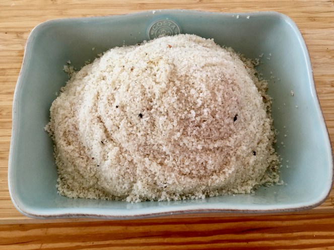 Mesclarem la sal amb les espècies al gust, afegirem l’aigua i seguirem mensclant. Pujarem el blanc d’ou fins que sigui escumós i l’afegirem a la sal.