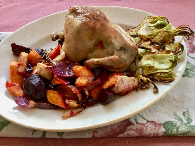 Per guarnir-lo el vaig acompanyar amb unes verdures rostides (moniato, remolatxa, api-nab, ceba morada, alls i romaní. Les verdures tallades a grells i amanides amb sal i pebre i un raig d’oli) que es feren en un altre palangana al mateix temps que la carn, a més d’uns talls de carxofa a la planxa.