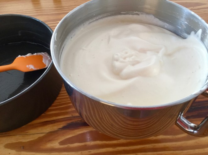 Separarem el blanc del vermell d’ou. Posarem el blanc en un bol gran o en el bol de la nostra màquina amb un pessic de sal i el pujarem a punt de neu. Sense deixar de batre hi posarem el sucre mòlt a cullerades, de manera que ens quedi una merenga. Afegirem els vermells un a un. Quan els tenguem ben integrats hi abocarem el midó a poc a poc i seguirem batent 5 minuts més.