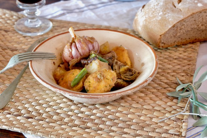 Passat el temps indicat afegirem les patates, la picada que haurem mesclat amb una mica del brou, la carxofa i les mongetes. Contarem 10 minuts més. Quan en faltin 5 hi posarem els ous per a què es confitin. Afegirem aigua si fos necessari i corregirem de sal. I a la taula!