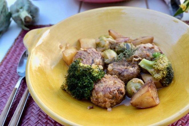 En una greixonera sofregirem la ceba que ens quedava. Quan sigui ben rossa hi afegirem la tomàtiga ratllada fins que sigui ben cuita. Hi posarem el vi blanc i poc després el brou de peix. Quan arranqui el bull hi posarem les patates i les pilotes i deixarem que cogui uns 10 minuts. Rectificarem de sal. També hi podem posar verdures de temporada com cols de brusel·les, pèsols d’oli, mongetes verdes, bròquil…
