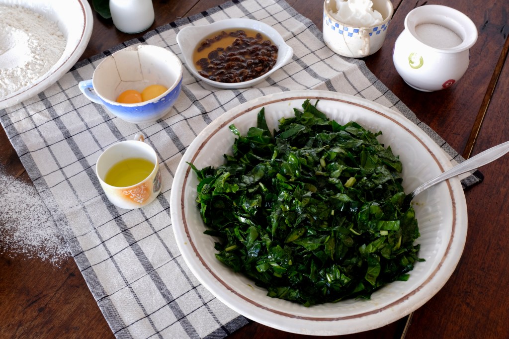Rentarem els espinacs i les bledes; treurem els tronxos. Deixarem que degoti la verdura. Tallarem les fulles en juliana no massa fina i les tremparem amb oli, sal, pebre bo i pebre bord. Posarem les panses a macerar en el brandy. Deixarem que tant les verdures com les panses reposin unes hores o tota la nit.