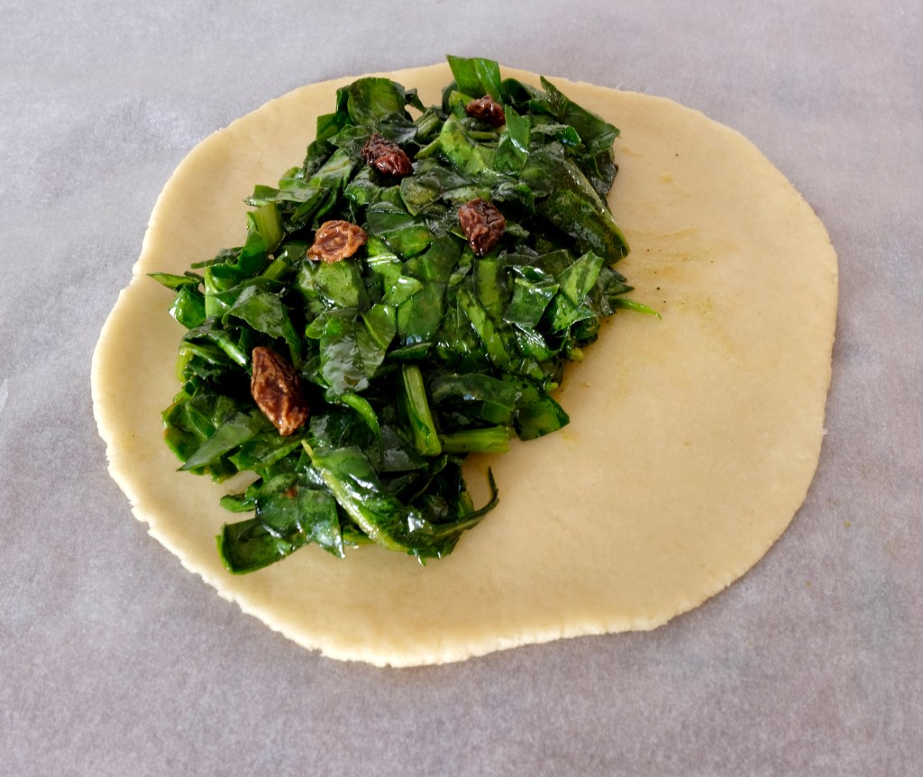 Tallarem bocins d’uns 100 gr cada un i farem una bolla, l’aplanarem amb l’aprimador procurant que ens quedi un disc fi. Posarem una cullerada de verdura a una part del cercle i unes quantes panses. Tombarem el costat lliure de verdura unint les voreres fent una mitja lluna i les pressionarem per a què quedi clos el robiol. Amb l’ajuda d’un tallador de pastes treurem els sobrants. Decorarem la vora amb les dents d’una forqueta o amb qualsevol altra eina que tenguem per a aquest propòsit. Farem el mateix amb tots els trossos de pasta.
