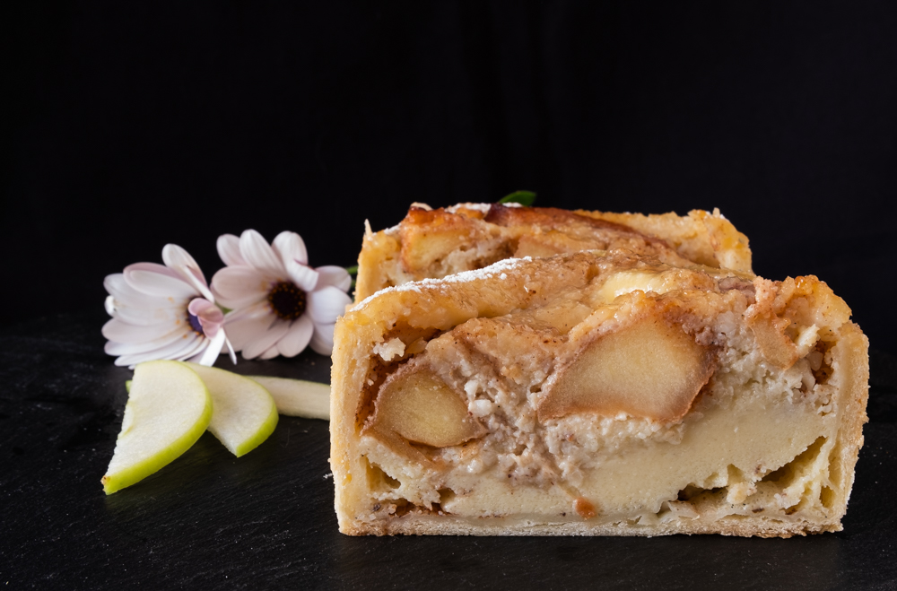 He combinat diferents tipus de poma (granny smith amb pink lady) i hi he afegit calvados. A mi m’agrada enfornar aquests pastissos el mateix dia perquè la base queda més bé. Si no teniu temps podeu preparar-ho tot el dia abans i després només serà muntar i enfornar. Jo en general ho faig així i en un momentet el tenc a punt.