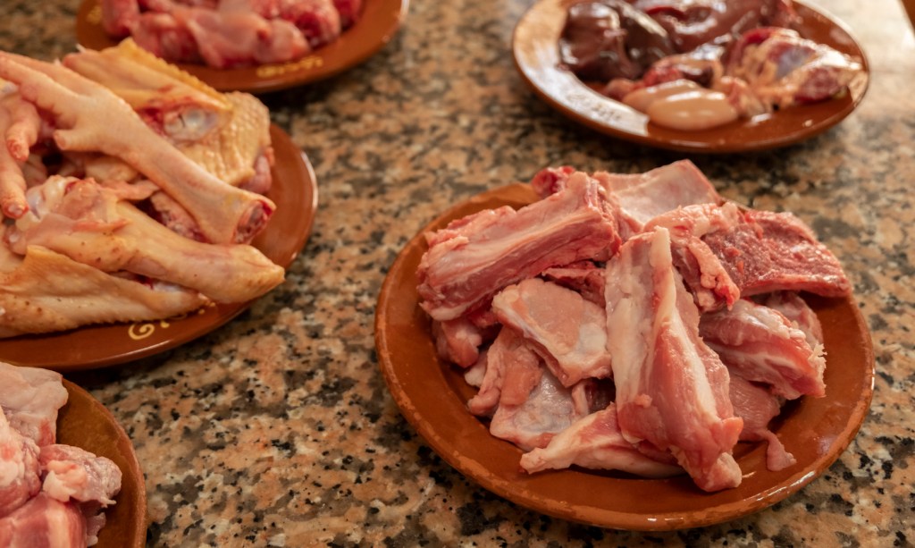 Tallarem la carn a bocins no molt grossos. En un calderó fondo hi sofregirem la carn i els fetges que aniran a la picada. Mentrestant aprofitarem per picar els alls, tallar la ceba i el pebre a daus i ratllar les tomàtigues. Quan la carn sigui cuita treurem els fetges i els reservarem. Hi abocarem la ceba, els alls i el pebre al mateix temps. Ho deixarem uns minuts al foc. Quan la ceba sigui rossa hi abocarem la tomàtiga, la sal i les espícies,manco el safrà i remenarem bé. No frisseu, la clau és fer un bon sofregit. Quan estigui fet hi abocarem l’aigua i deixarem que bulli 45 minuts.