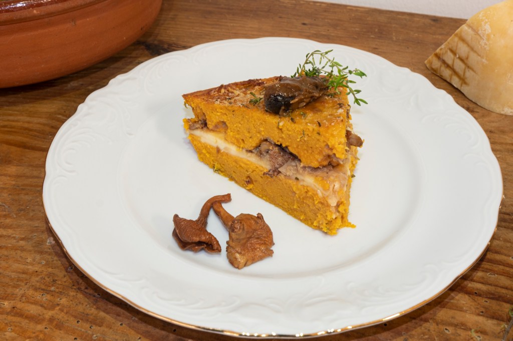 Untarem una greixonera de saïm o amb mantega. Hi posarem la meitat del moniato i el taparem amb formatge tallat ben prim però que n’hi hagi arreu. Seguidament hi posarem els bolets i els taparem amb el moniato que ens queda. Empolsarem amb formatge ratllat i farigola i l’enfornarem a 180 ºC uns 40 minuts o fins que vegem que la superfície està ben daurada i a dins ha eixugat bé.