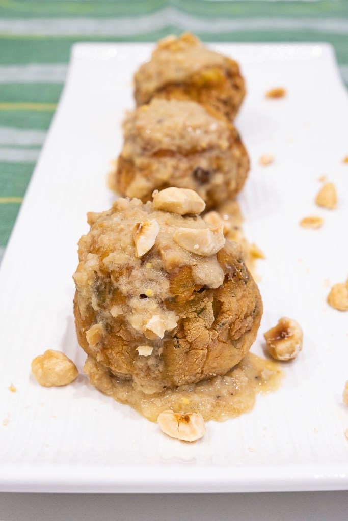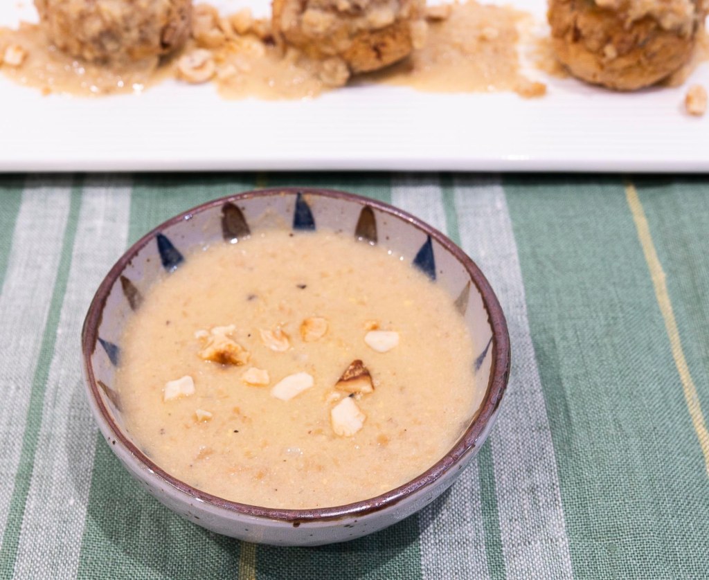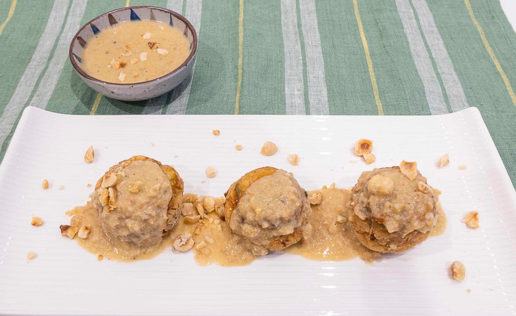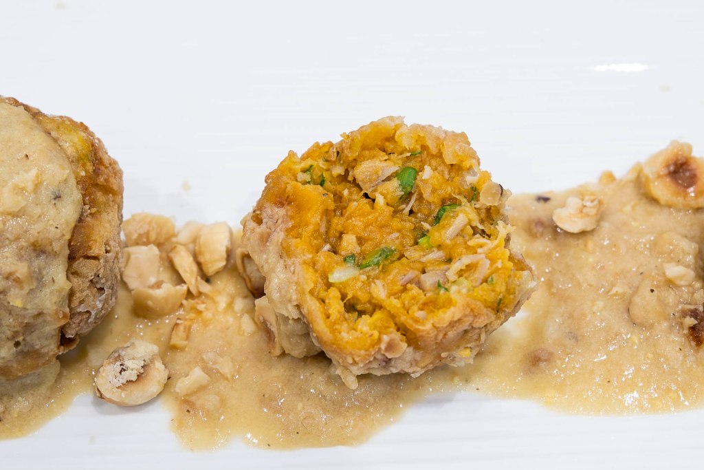 En algunes ocasions la base pot ser una verdura, com és el cas de les pilotes de carxofa i peix sec, com les que trobam en la publicació menorquina abans citada o les pilotes de patata de Cuina popular de Mallorca (Sóller, 1933). Una solució molt atractiva i diferent que m’ha cridat l’atenció. En el meu cas l’he emprada com a recepta d’aprofitament, per treure rendiment a la carn del brou. He substituït la patata per moniato perquè aguanta millor si les volem fer d’un dia per un altre. Com que volia fer un plat més adequat per a una picada o un sopar les he acompanyat amb una salsa senzilla d’avellanes que en realitat podria ser de qualsevol altra fruita seca… però segur que funcionen molt bé dins uns escaldums on no caldria posar patata.