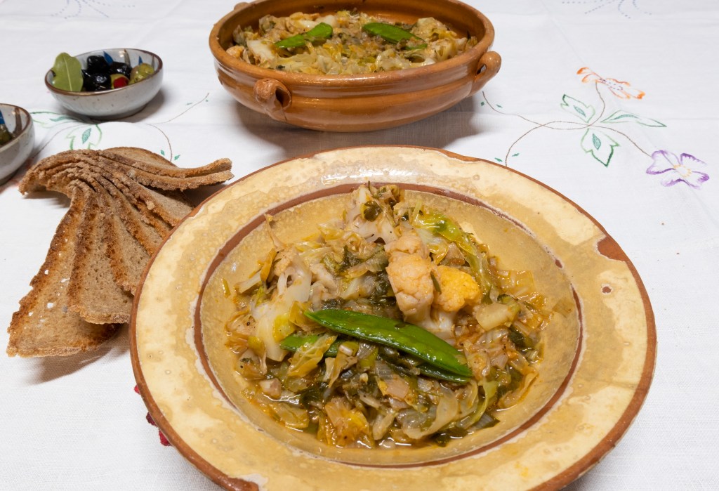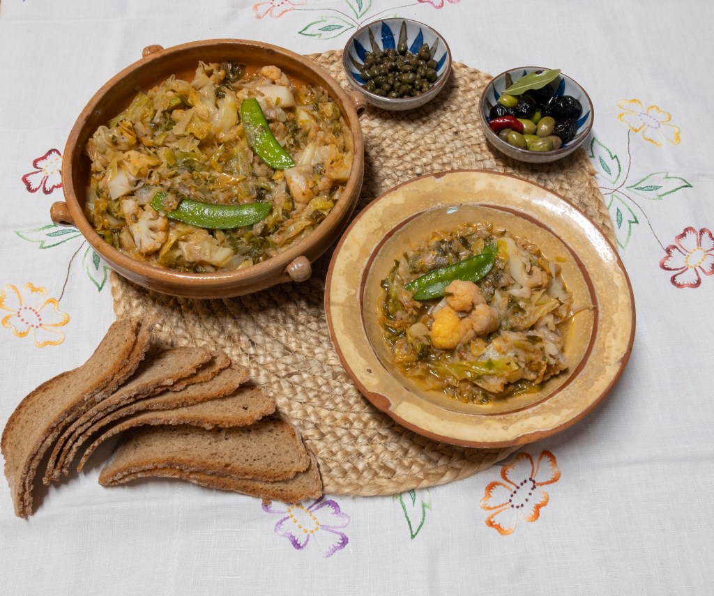 En una altra greixonera farem un sostre de verdures, hi posarem sopes de pa per damunt i les regarem amb un raig d’oli cru, taparem amb un altre sostre de veerdures i deixarem que s’amarin una mica. Servirem calentes acompanyades d’olives, rave i unes tàperes envinagrades.