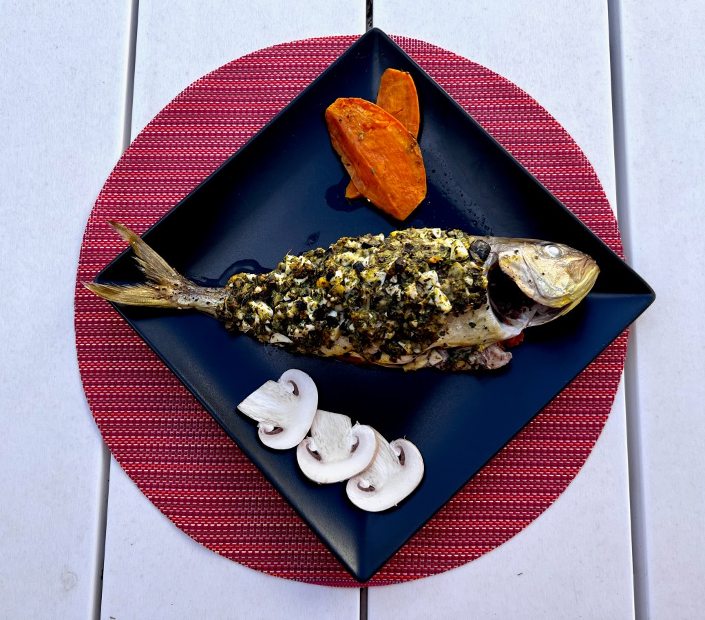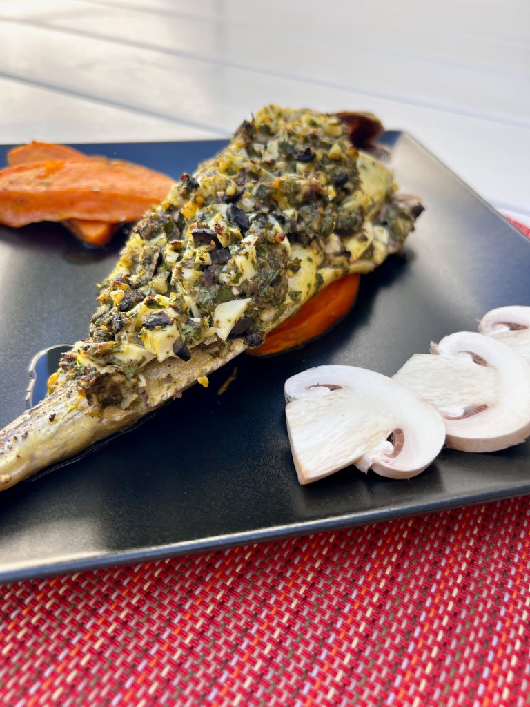 Posarem el peix damunt les patates. Li farem dos o tres talls en el llom i hi posarem la picada per damunt. Regarem amb un raig de vi blanc i una mica d’oli. Ho enfornarem entre 15 i 20 minuts, segons la grandària del peix.