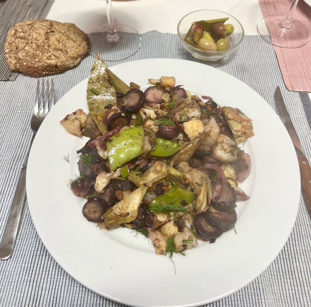 anomenada Frito: ceba, albergínia, pebre i carabassó tallat llaguer, tot fregit amb la carn del
