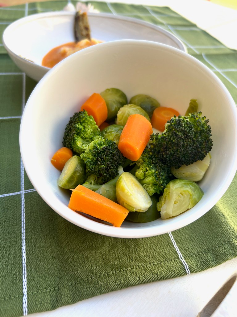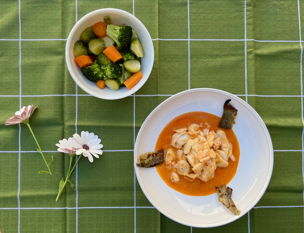 En una greixonera hi posarem la cullerada d’oli i hi sofregirem la cullerada de pebre bord, a mig foc i sense deixar de remenar. Tot seguit hi abocarem uns 200 ml de l’aigua del bacallà. Deixarem que bulli una estoneta. Baixarem el foc i hi posarem una cullerada generosa d’allioli i el disoldrem amb l’ajuda d’unes varetes. Deixarem que la salsa cogui lentament i que redueixi una mica. Hi afegirem el bacallà i dos o tres minuts més tard apagarem el foc. Servirem calent. En el meu cas vaig acompanyar el plat amb unes verdures que havia cuit al vapor.