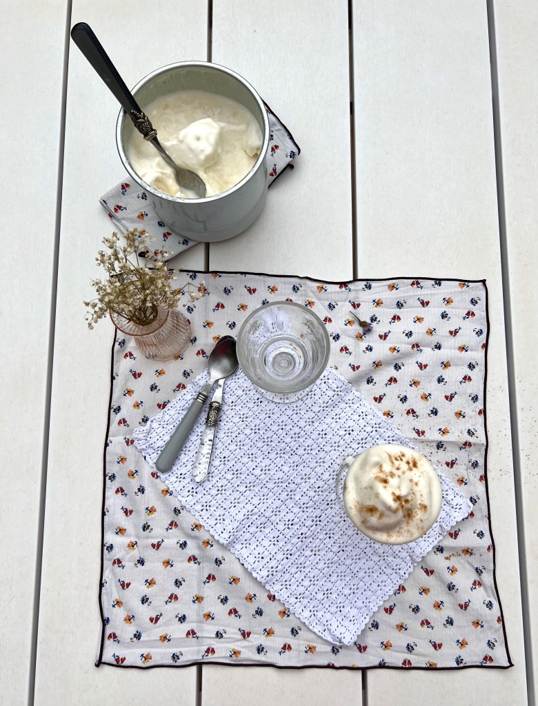 Treurem la llet infusionada i romprem els cristalls de gel fins que tenguem una crema. Hi afegirem la merenga en 3 tandes, en moviments envolvents. Servirem acompanyada d’una mica de canyella en pols.
