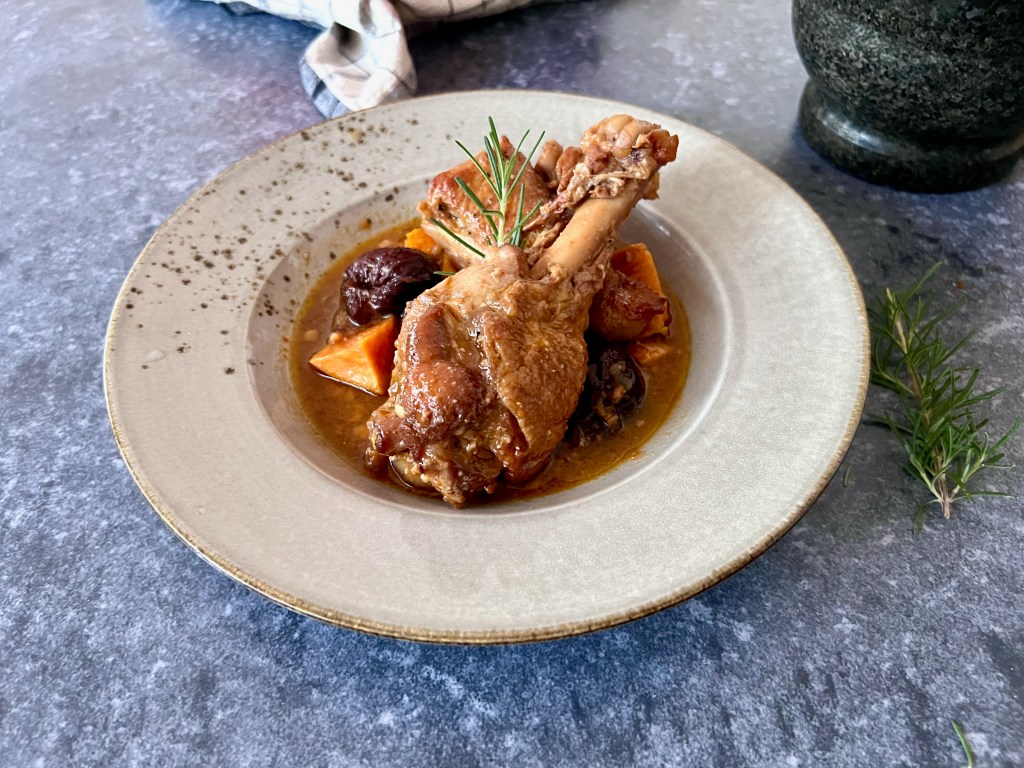 Per a la recepta d’avui he fet la meva pròpia versió de l’indiot amb prunes de Memòria de la cuina mallorquina, d’Antoni Tugores i de la recepta del mateix nom de Biel Frontera a Aplecs d’usos de cuina al Pla de Mallorca. En honort de les dues receptes he conservat el nom però també he emprat dàtils i albercocs. Esper que sigui del vostre gust.