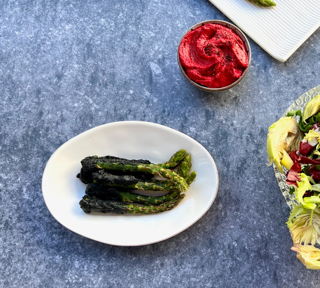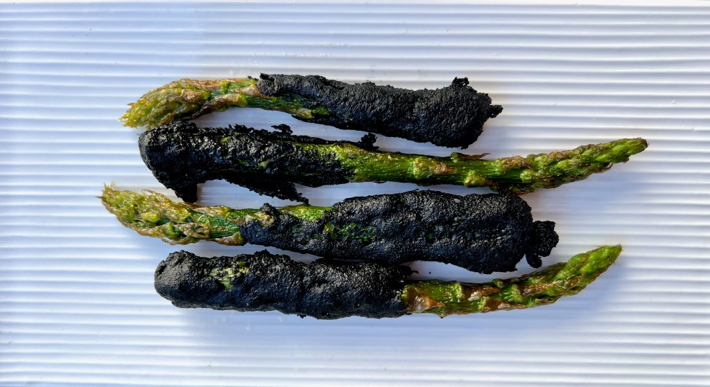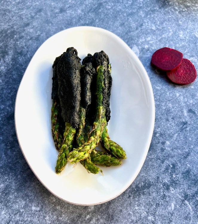 La recepta d’avui parteix d’una de les més humils del llibre, uns espàrrecs fregits que s’arrebossen en una pasta espessa. Una recepts molt semblant apareixerà en el llibre Cocina práctica de cuaresma editat a Barcelona en el 1905. La idea de la pasta negra és del llibre Técnicas básicas para cocinar en casa de Joan Roca, en una recepta quasi idèntica al volum quaresmal de principis del s. XX Esper que sigui del vostre gust.