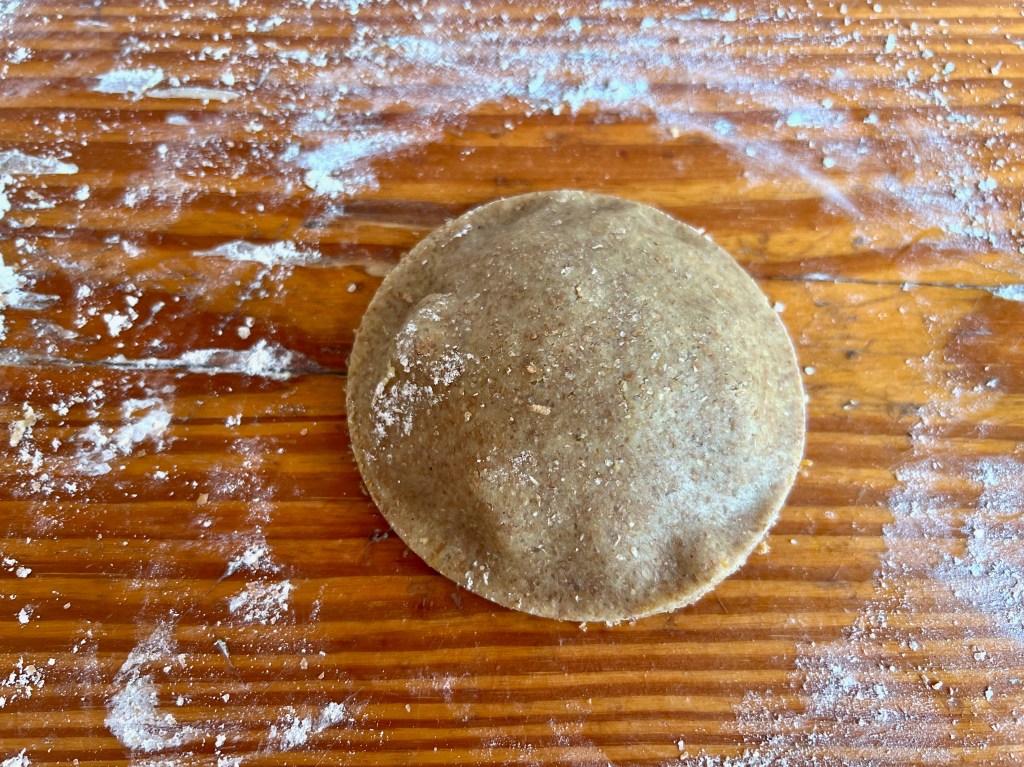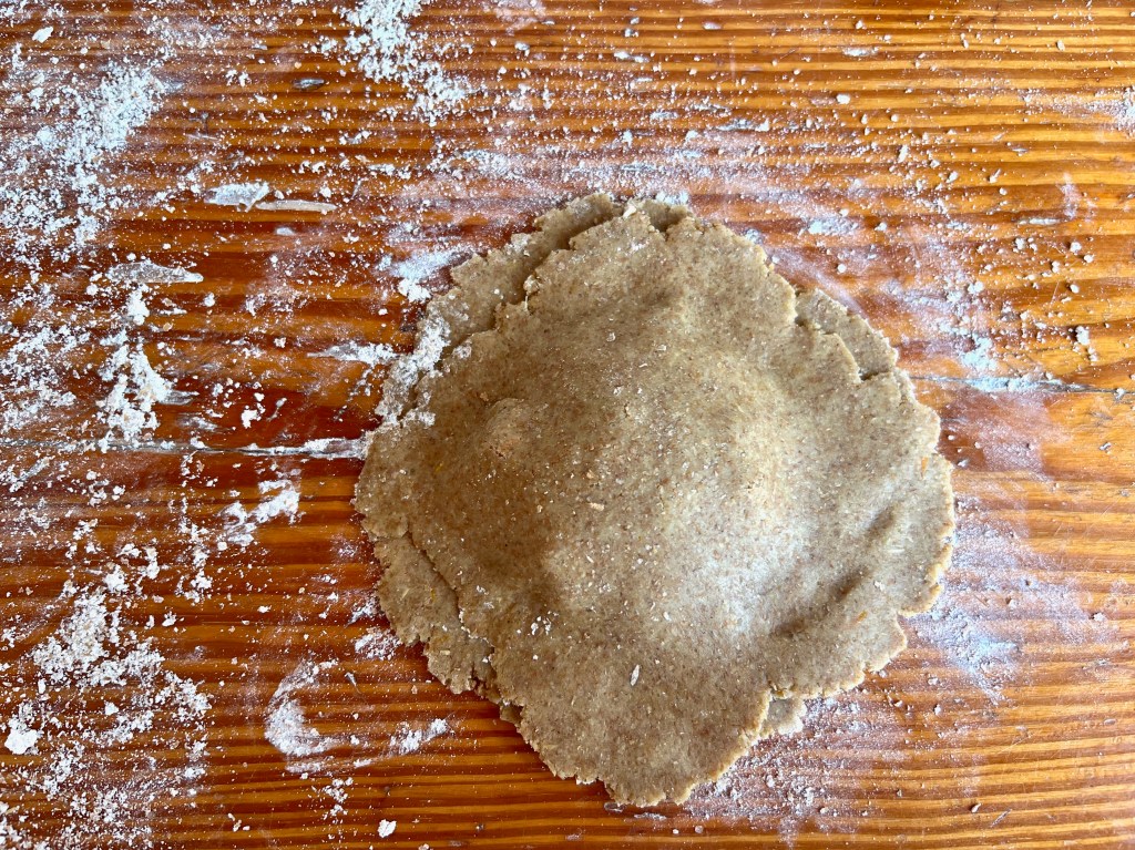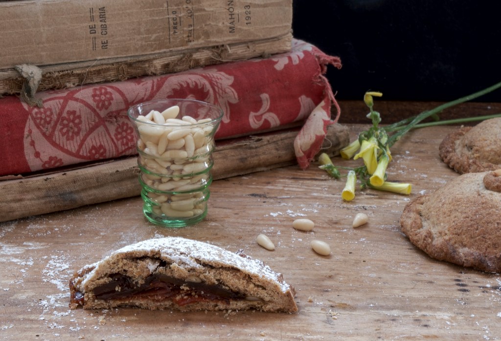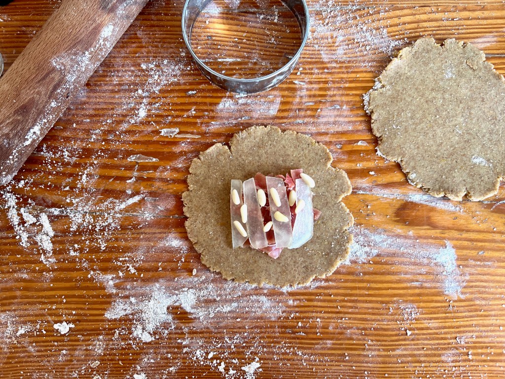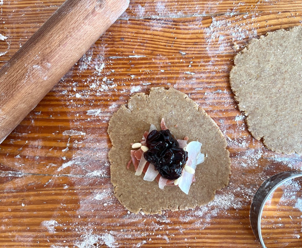 Farem boles d’uns 50 gr cada una i les aprimarem. Posarem el cuixot salat, el carabassat i els pinyons sobre un bocí de pasta. Regarem el farcit amb una cullerada d’aigua i hi posarem la confitura a dalt. Taparem amb un altre bocí, tallarem els restants de pasta i clourem les voreres fent pessics.