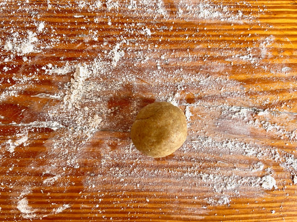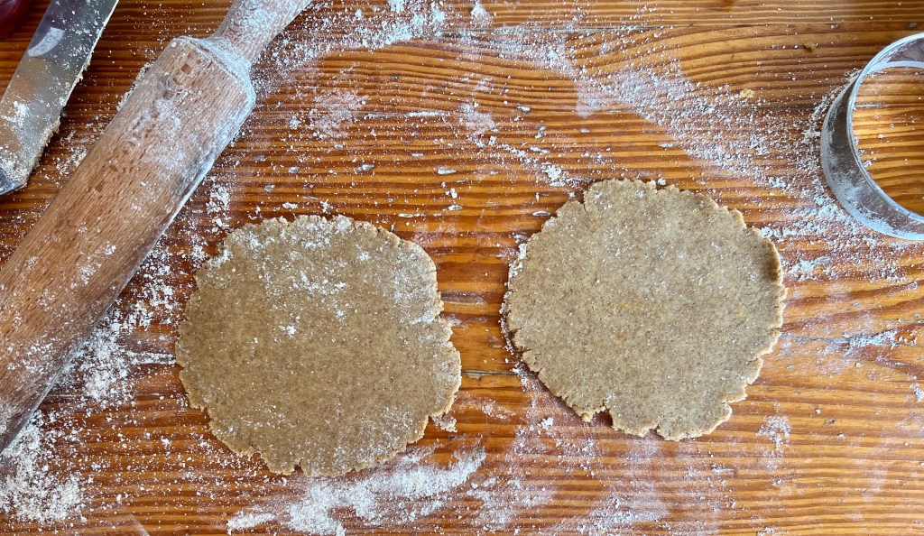Primer de tot farem la pasta. Mesclarem el saïm amb el sucre, els vermells d’ou, la canyella, la ratlladura de la pell llimona i i la ratlladura i el suc de taronja. Quan tenguem una crema homogènia hi posarem la farina que haurem passat prèviament pel sedàs. Pastarem fins que tenguem una massa que no s’aferra a les mans. Deixarem que reposi una mica.