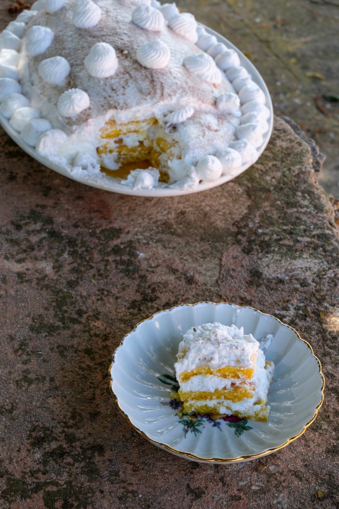 Per muntar el soplillo farem una base de bescuit, el pintarem amb el licor de taronja, després hi escamparem una capa lleugera de confitura d’ou, merenga i repetirem la mateixa operació amb cada capa. Decorarem amb merenga i empolsarem de canyella mòlta. El posarem a la gelera per a què agafi cos.