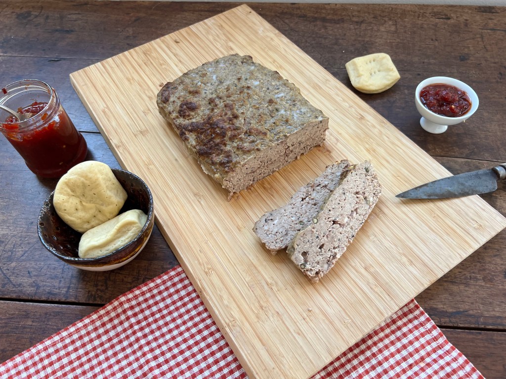 Primer de tot picarem el fetge, la carn i la xulla, Ho mesclarem amb els ous, la salsa beixamel i el raig de licor. Tremparem la carn amb les espícies i el pebre verd en gra al gust. Untarem un motllo amb saïm i hi abocarem la pasta. Posarem algunes boletes de saïm repartides sobre la carn. Courem el pastís al bany maria uns 40 minuts a 170ºC o fins que vegem que el ganivet ens surt net. Quan el pastís sigui fred el posarem a la gelera i el desemmotllarem a l’endemà. Jo el vaig servir acompanyat de confitura de pebres i va ser un bon entrant.