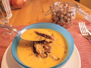 De cop i volta ha arribat el fred, pareixia que no tendríem hivern però ja és aquí. I amb aquestes temperatures ve molt de gust prendre plats calents. Les sopes i les cremes són molt adients per menjar ara i són tan fàcils de fer que amb mitja hora pots tenir un primer plat saludable i senzill. Avui he fet aquesta crema aprofitant que tenia carabassa i l’he acompanyada amb xitaques. M’ha agradat la combinació, els bolets li donen un toc melós i contrasten bé amb la dolçor dels vegetals.
