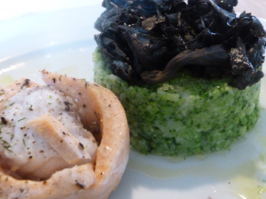 Per a aquesta recepta he combinat la cocció al vapor del peix amb el bròquil bollit. D’aquesta manera m’ha quedat la verdura més manejable a l’hora de fer el puré. És una recepta molt fàcil i es pot fer de moltes altres maneres. Les trompetes negres tenen un gust una mica fort però amb el puré de bròquil queda bastant suavitzat.